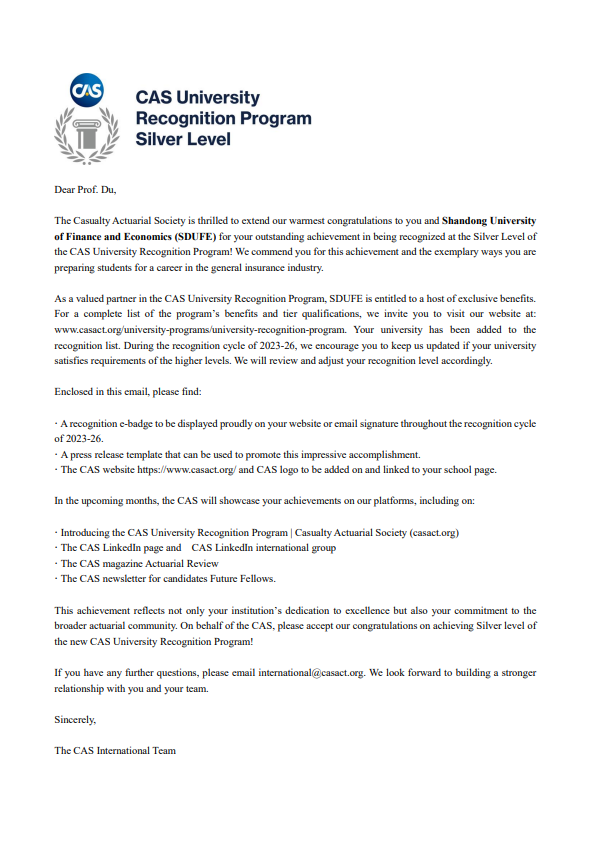 3月14日,北美产险精算师协会(Casualty Actuarial Society,CAS)致函我校,确认禁忌书屋 精算项目已通过其高校认证项目(University Recognition Program)的严格审核并荣获“Silver Partner”认证。这标志着我校成为中国大陆首批获此殊荣的三所高校之一,彰显了我校在精算教育领域的卓越实力。截至目前,全球共有47所高校通过CAS的高校认证项目,中国大陆仅三所高校,分别为禁忌书屋 、湖南大学和中央财经大学,获得认证的高校将在精算教育和研究方面得到CAS提供的特别资助。